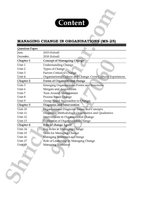 Many experts thought that you should read the IGNOU Study Material before taking any IGNOU Exam. IGNOU Study Material should be the first thing the student looks at, even if they use other resources. Therefore, we made IGNOU MS-25 Study Material with important questions and answers so that you can easily find what you need. This is the best IGNOU MS-25 Guide Book for you in a way that is clear. You can get all the information you need in this help book and it is very easy to find. Units and Blocks are well explained in this MS-25 Study Material, and the language is simple so that you can understand it better. Overall, buy this IGNOU MS-25 Help Book titled Managing Change in Organisations from us and get the best help for your term end examination or assignment from us.